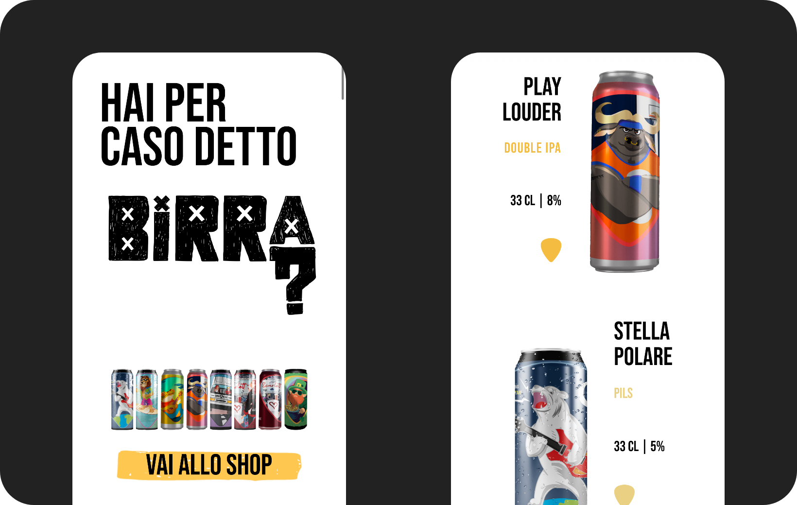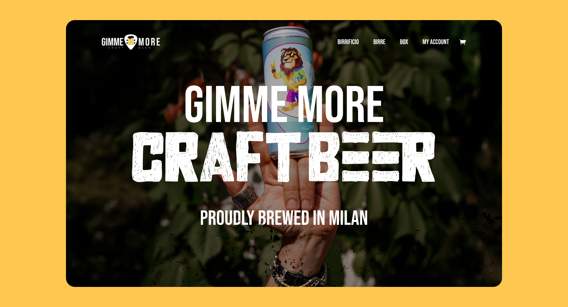 Abbiamo costruito l’interfaccia attorno all’identità visiva di Gimme More: giallo acceso come colore dominante, caratteri tipografici netti e illustrazioni dallo stile irriverente. Il design riprende l’immaginario del brand più che il birrificio in sé, con riferimenti al mondo della musica e della cultura pop.