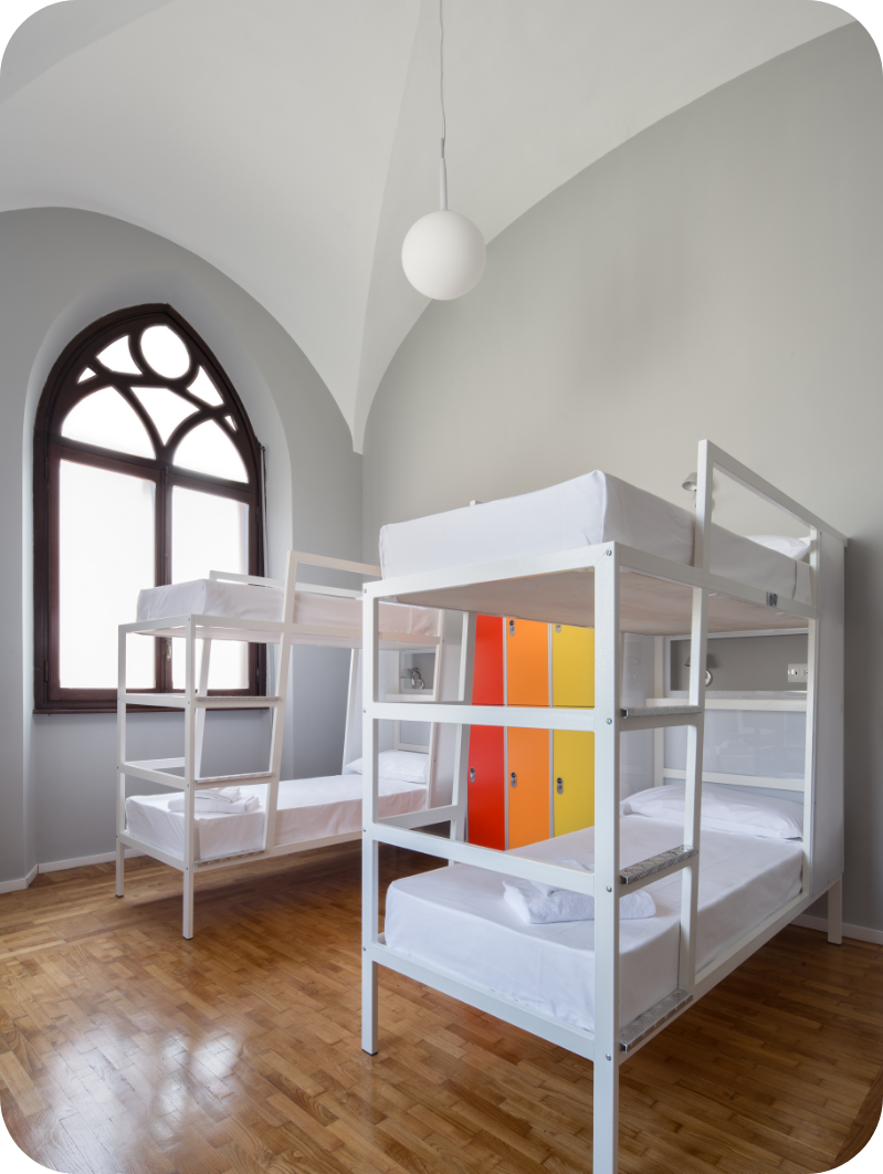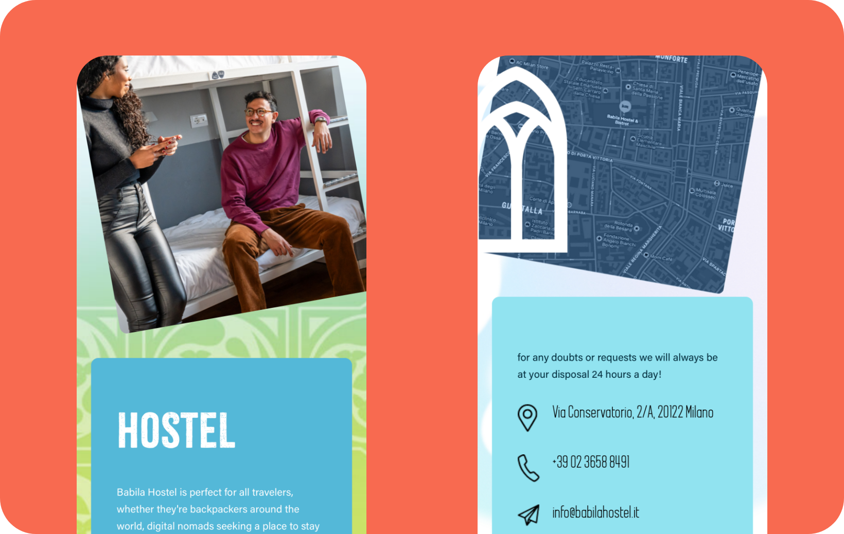 Il layout flessibile e le immagini immersive trasmettono l’atmosfera vibrante dell’ostello, offrendo un’esperienza coinvolgente e funzionale per ogni utente.