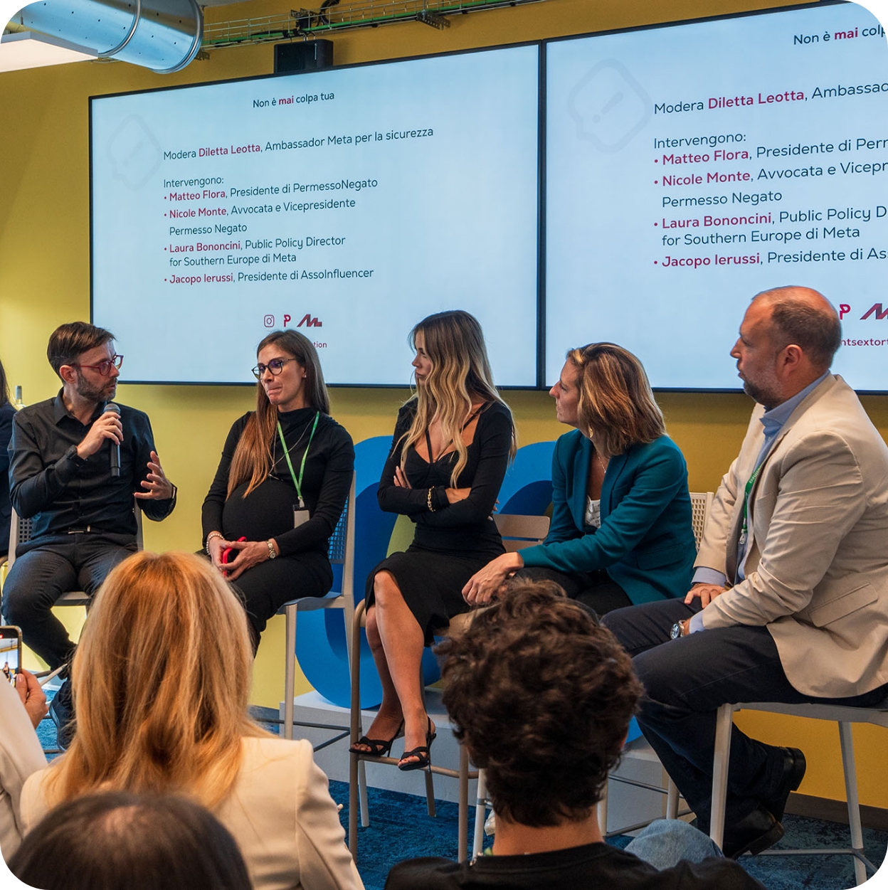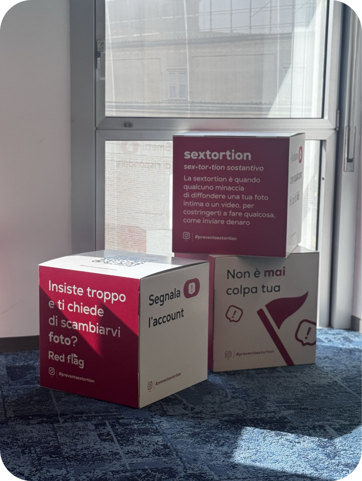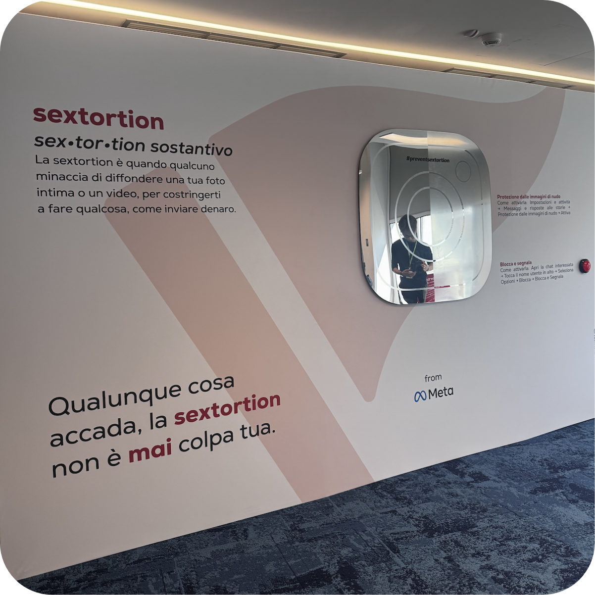 Il progetto nasce dalla richiesta di Meta di sviluppare l’identità visiva e gli allestimenti per un evento dedicato alla campagna “Non è mai colpa tua” – #preventsextortion, promossa per sensibilizzare sul tema della sextortion e per presentare i nuovi strumenti di sicurezza introdotti su Instagram.