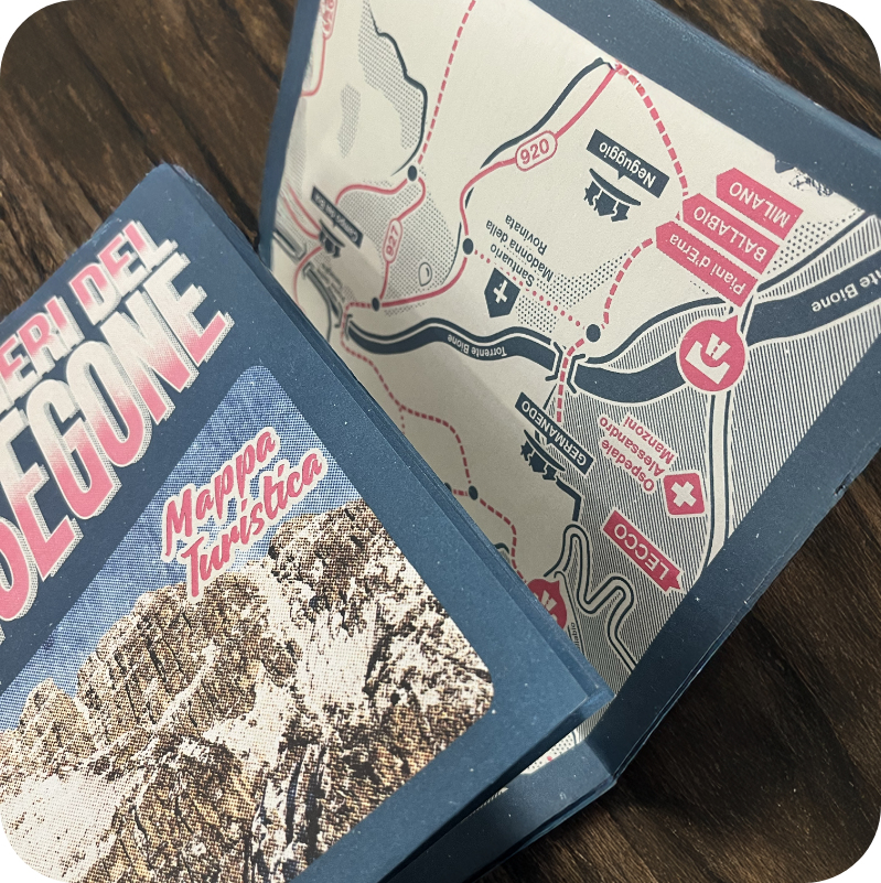 Abbiamo scelto un formato a libricino pieghevole, compatto e leggero, per permettere a chiunque di portarla facilmente nello zaino o in tasca. Ogni piega racconta un pezzetto della montagna, ogni facciata svela un dettaglio.