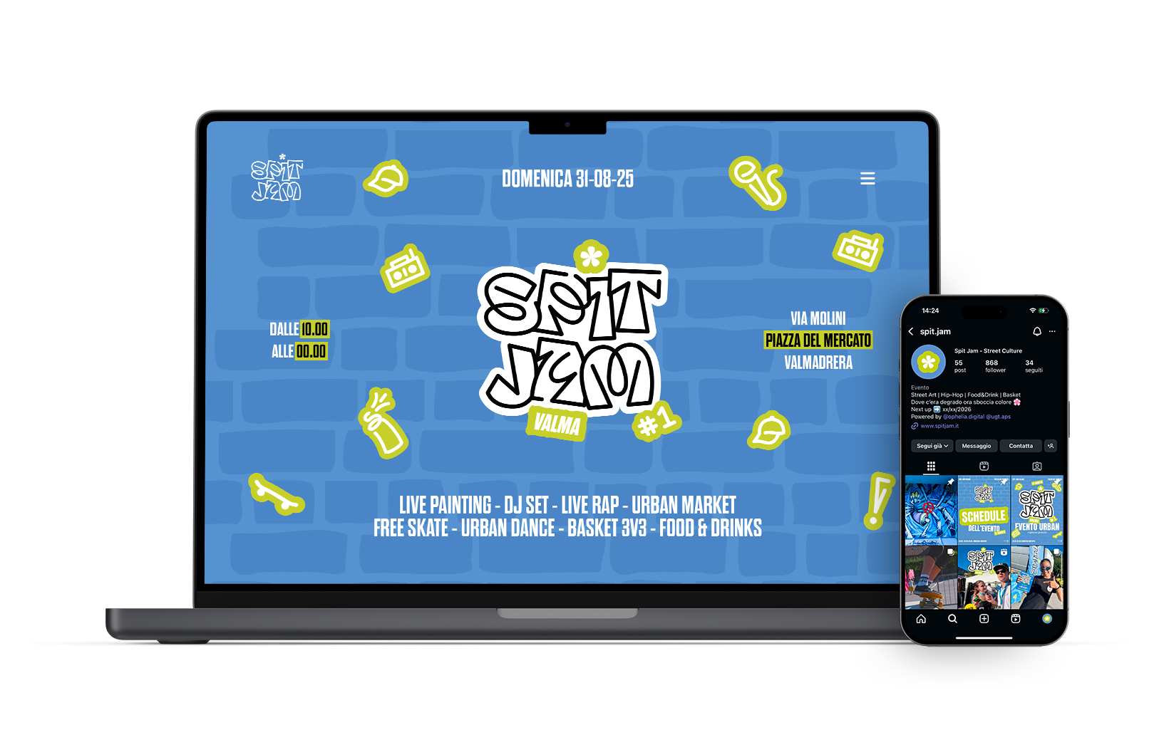 Il sito web di Spit Jam è stato progettato come uno spazio digitale capace di raccontare l’evento con la stessa energia che lo caratterizza dal vivo. La realizzazione ha seguito una logica semplice e immediata: una struttura chiara, pensata per guidare l’utente tra contenuti visivi e testuali, con grande attenzione all’impatto grafico e alla coerenza con l’identità visiva dell’evento.